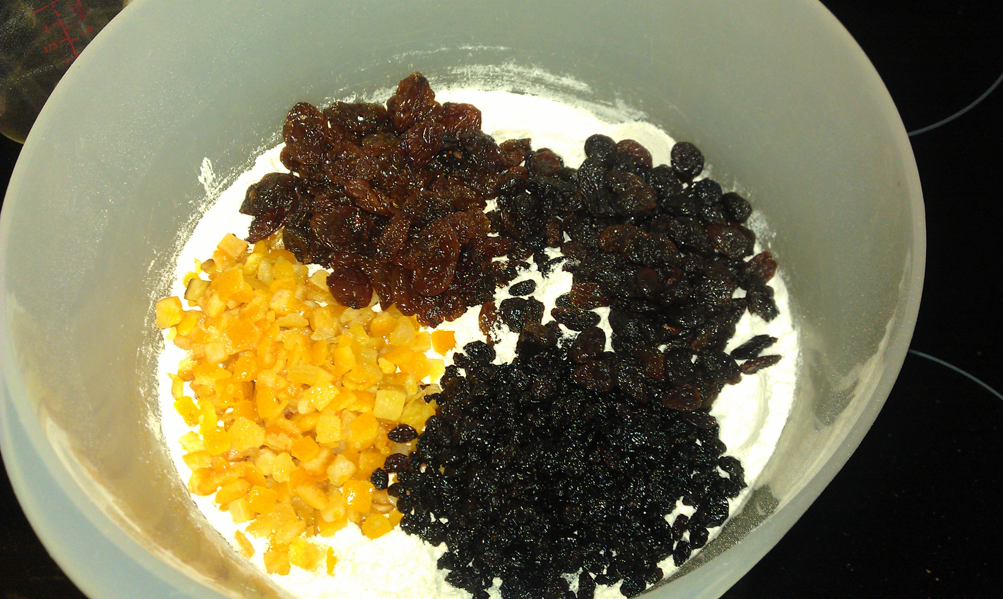 Mix the fruit into the dry ingredients, then stir in the water. Ensure there are no clumps of dry flour, but no need to stir past that point.