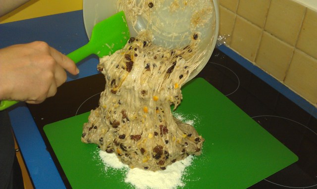 Your dough should have at least doubled in size and be very sticky. Scrape it onto a well-floured surface; lightly cover the dough in flour so it is no longer sticky.