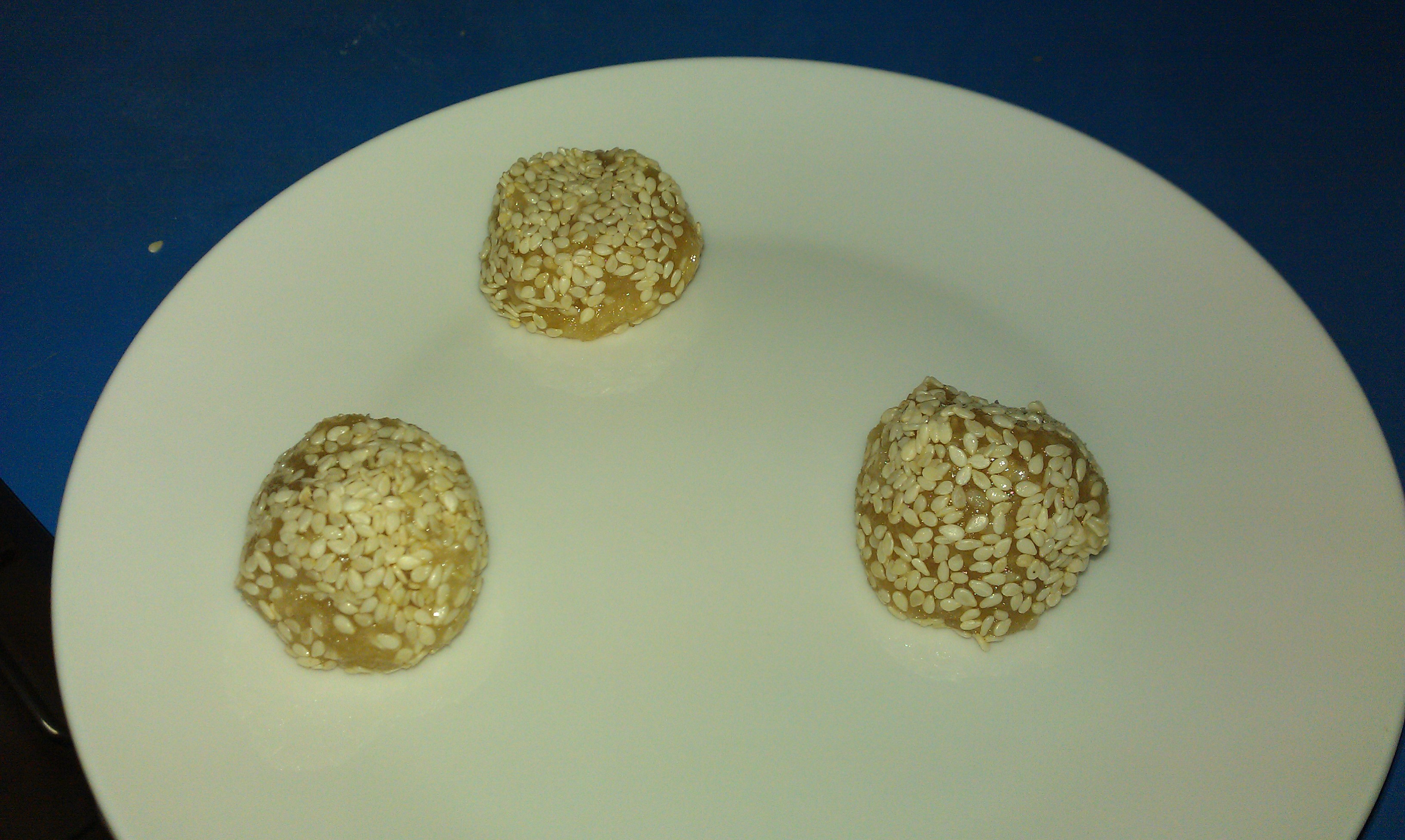 Put the sesame seeds in a blender until partly blended, add remaining ingredients plus a tablespoon of water at a time, continue blending and adding water until the desired texture is achieved. Firmer mix is better for rolling.