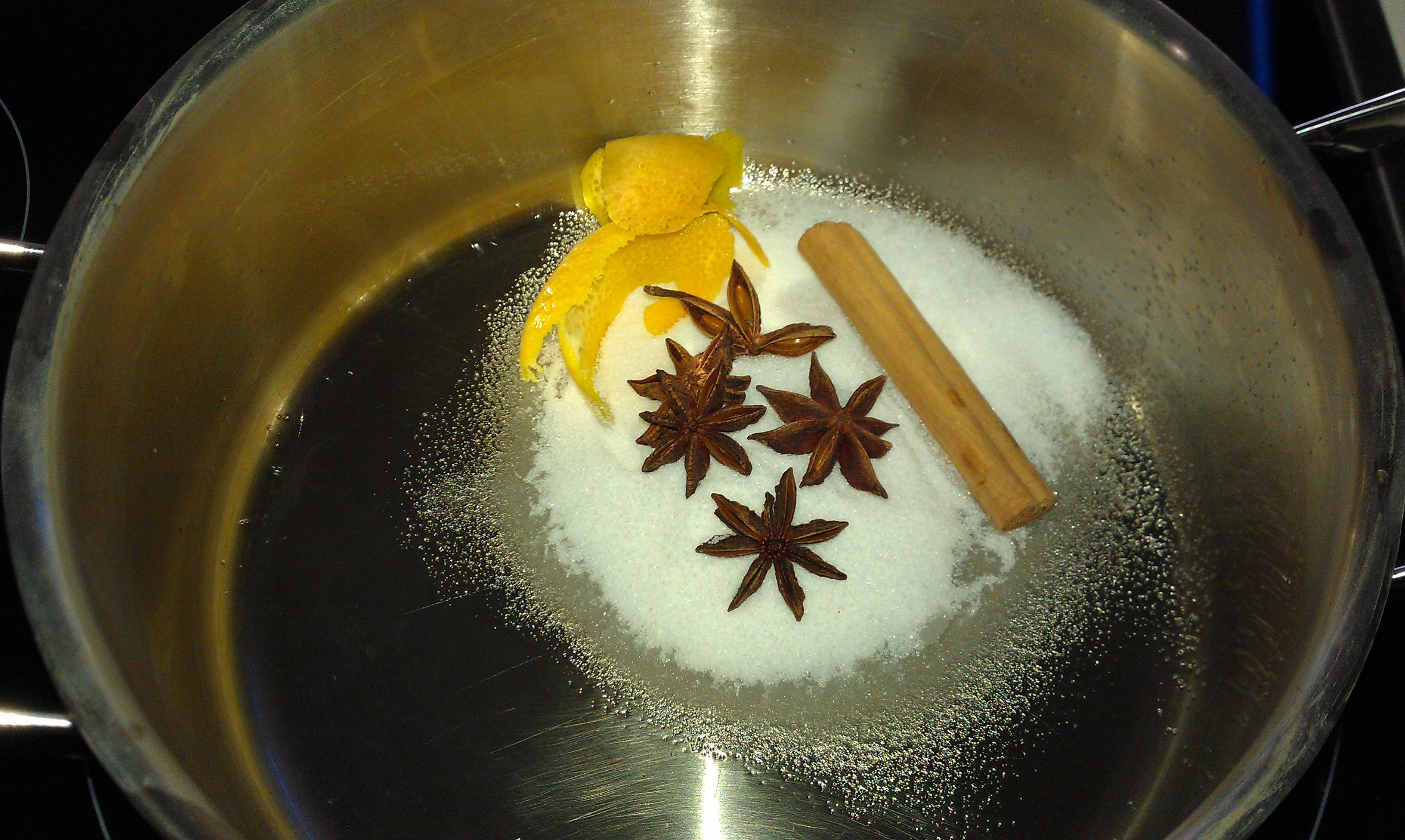 Mix your sugar, spices, orange peel, wine and juice in a saucepan that is big enough to fit all your pears in snuggly. Heat the mix, stirring to dissolve the sugar.