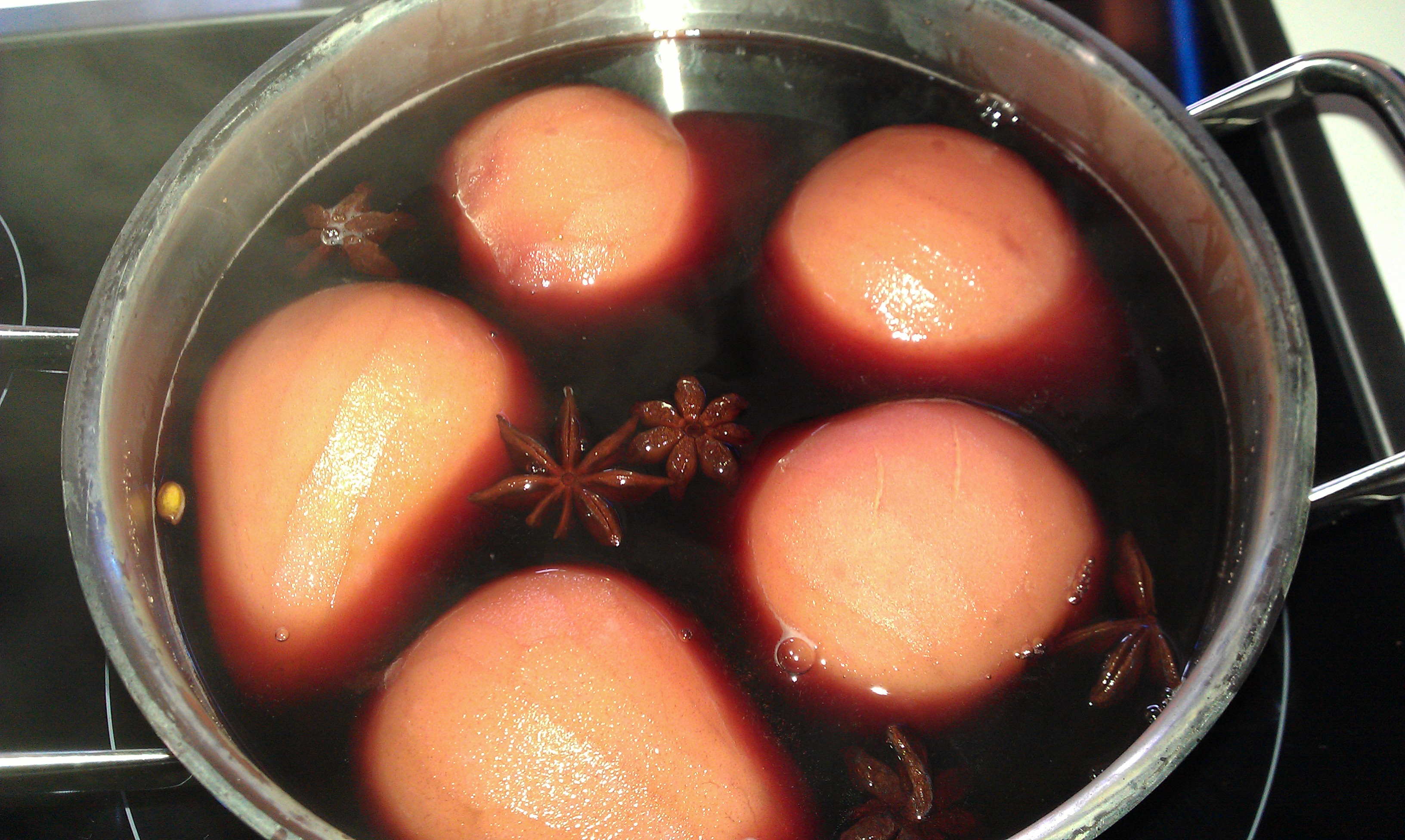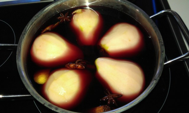 Clearly my saucepan was not big enough for 6 pears, but we only had two guests so it was ok. Place your pears into the wine and add water to your pot until the pears are just covered.