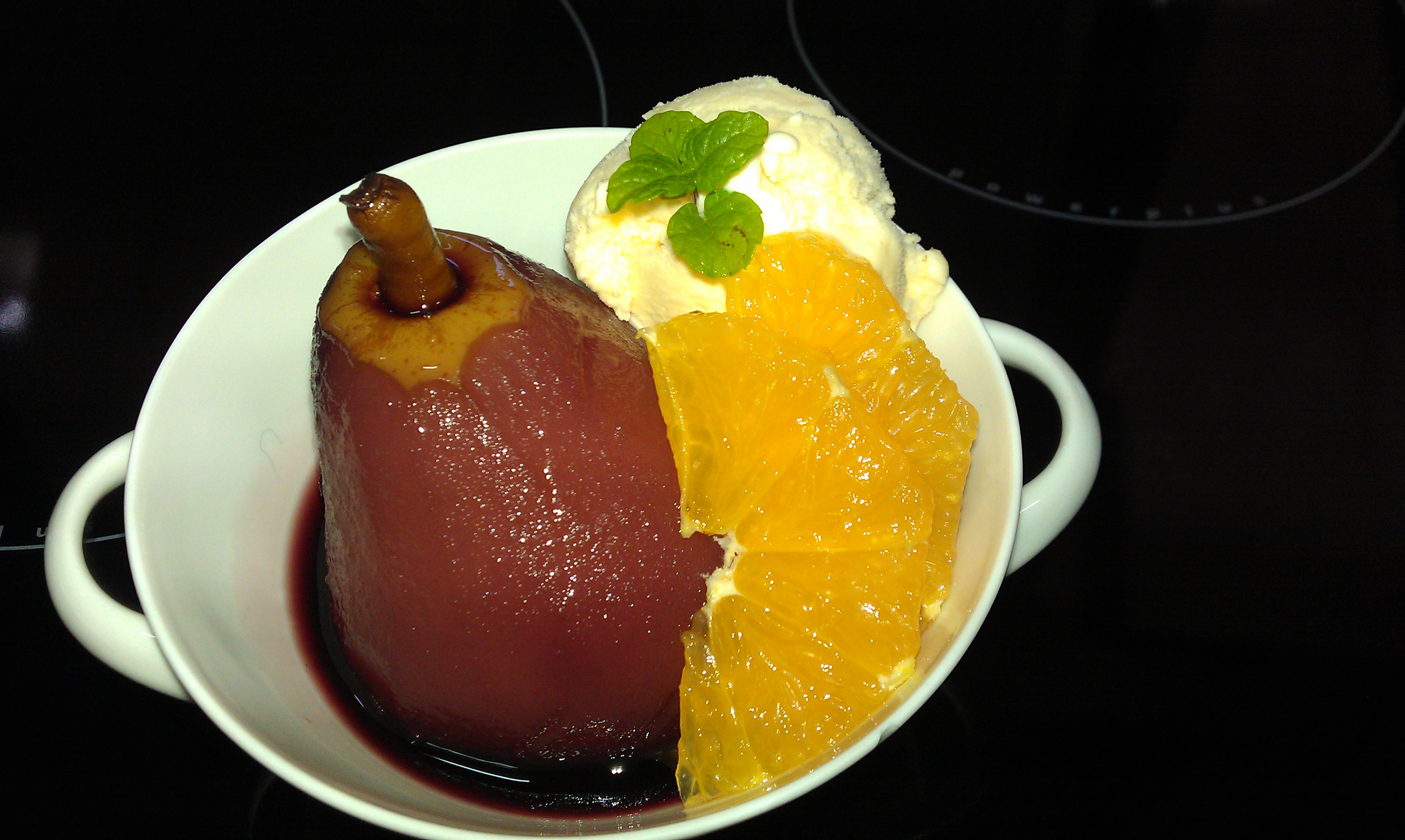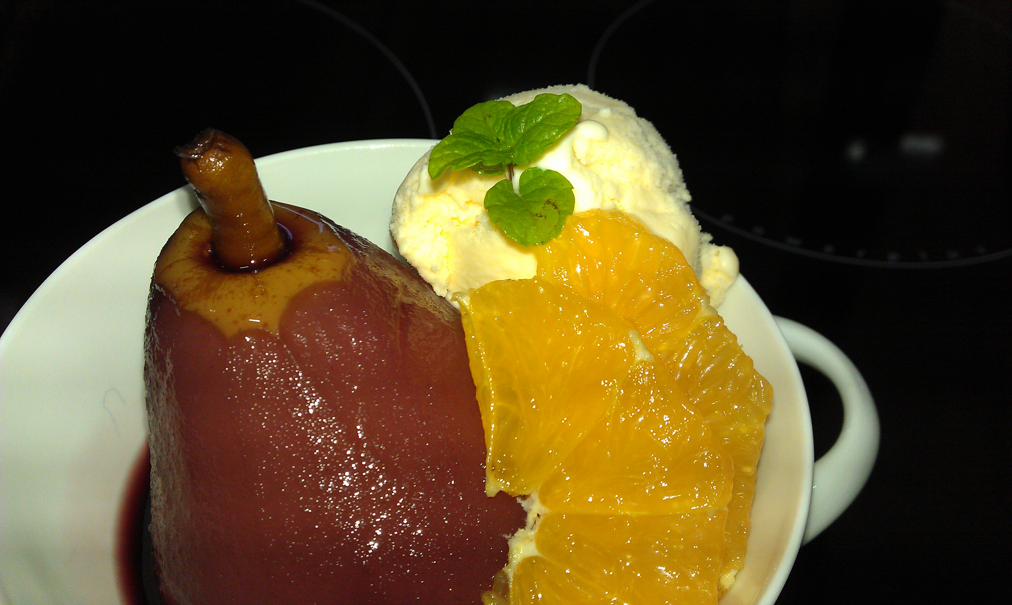 Serve with icecream or double cream, some of the spice wine syrup (strained of the spices) and with a couple of orange wedges for flare.