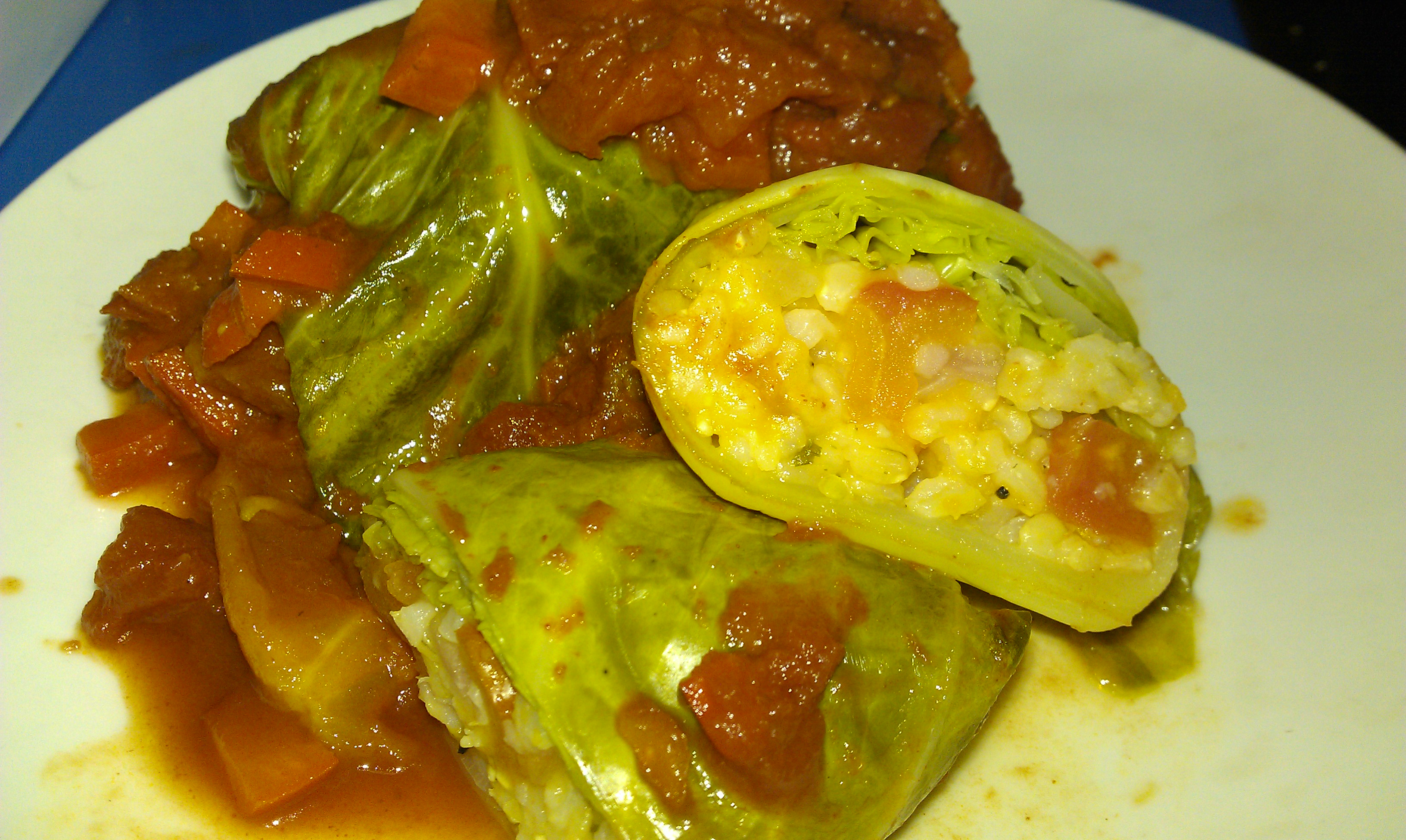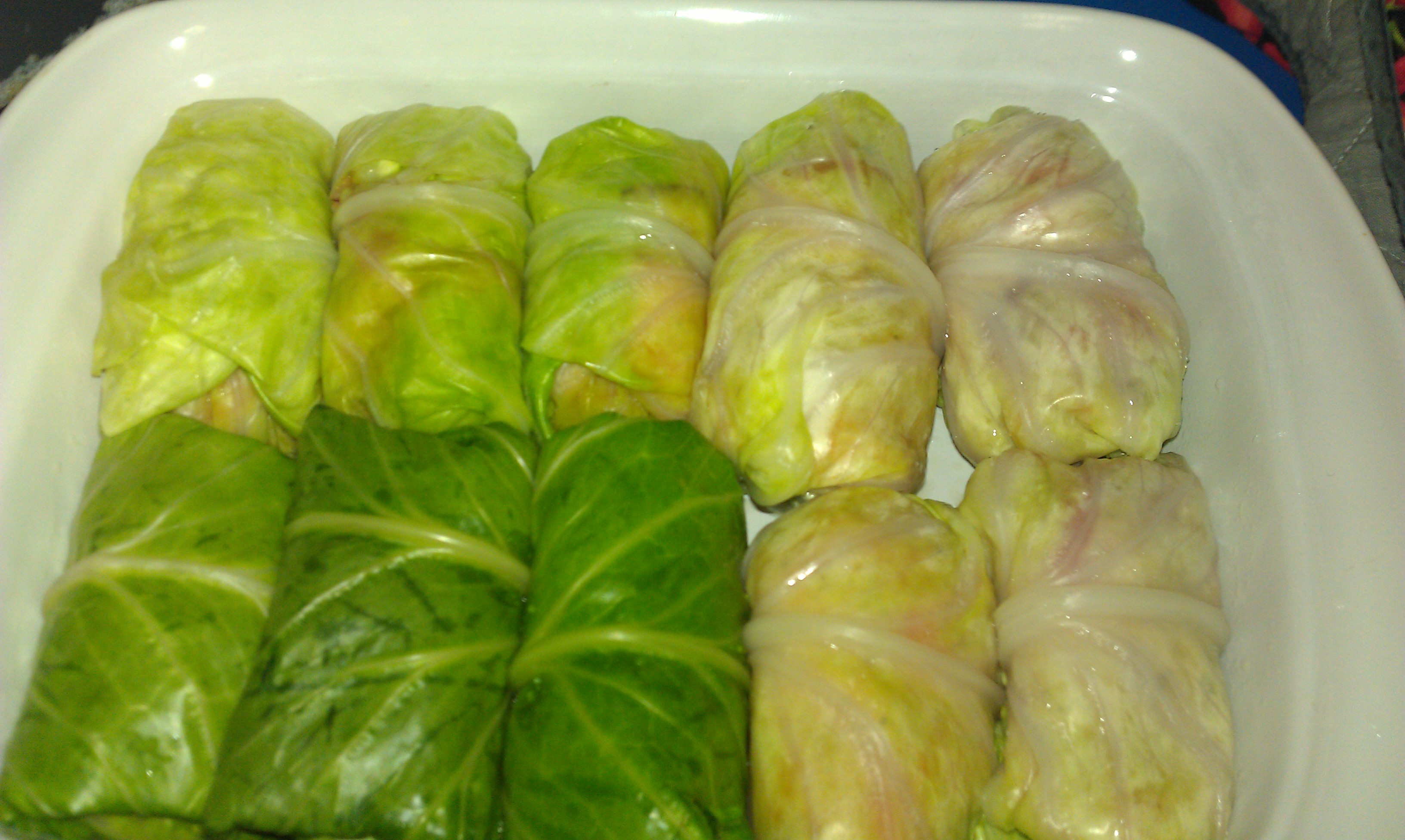 Roll about half a cup of stuffing in each cabbage leaf, neatly arranging them in a lasagne dish which has been lightly oiled.