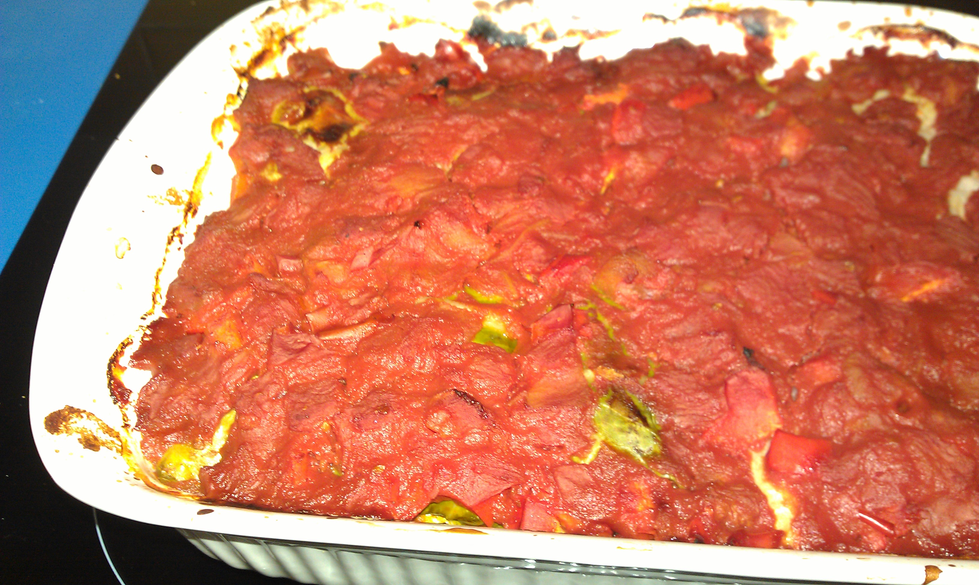 For the sauce you could use a jar of pasta sauce, but I like a diced capsicum, a sprinkle of paprika (you can see why I buy spices by the pound!), and a large can of diced tomatoes.