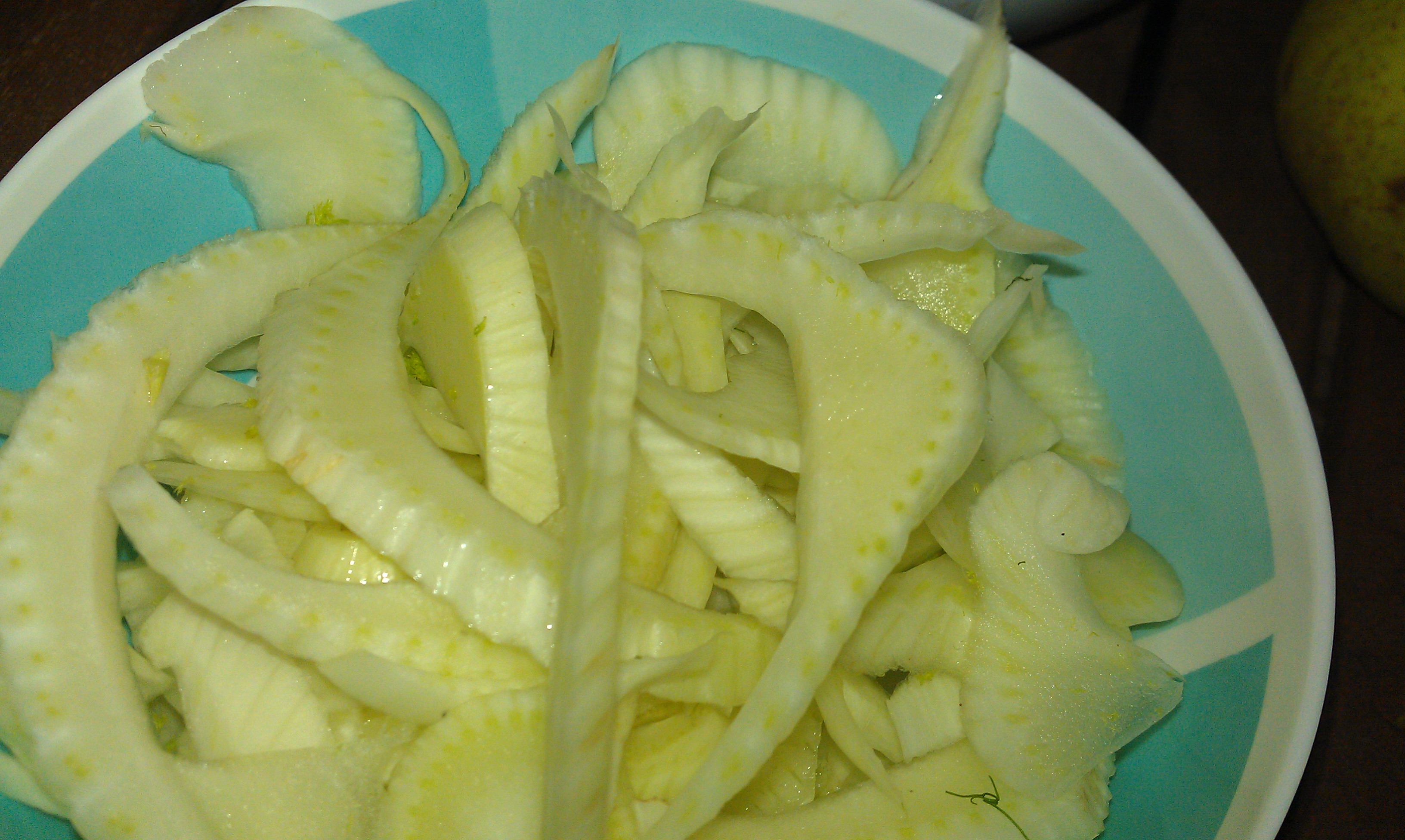 Slice the fennel fairly thinly, ensuring it is still thick enough that the fennel will be crunchy and of substance in the mouth.
