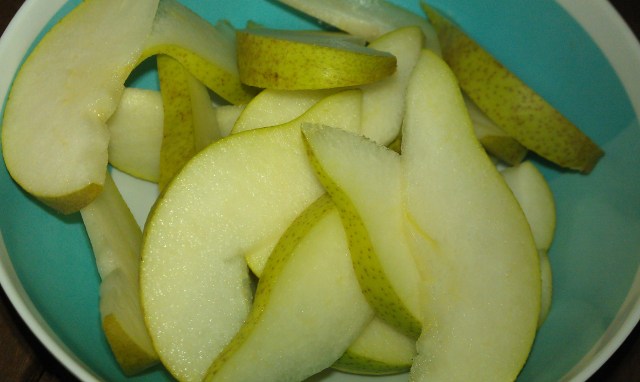 Slice your pear in quarters, core and then slice each quarter into 4 or 5 wedges of the same thickness as the fennel. Slice your cheese very thinly so it is little shavings of cheese that will disperse throughout the salad and bring little bursts of saltiness to each mouthful.