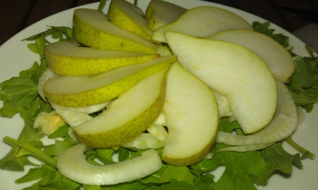 Arrange the salad by making a bed of rocket leaves upon which the fennel and then the pear will lie.