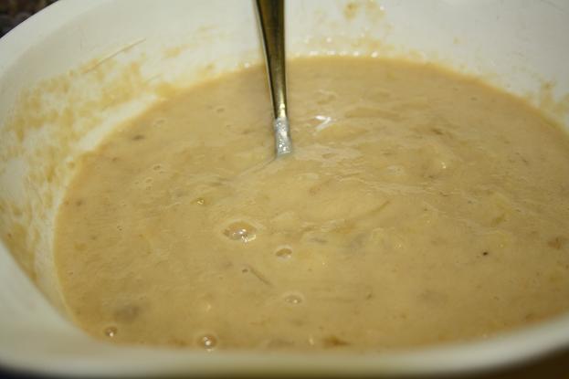 Sift in the flour, baking soda and cinnamon, mix until combined. My mix was sufficiently moist, but if your bananas are less ripe than mine you can add some milk until you get a good batter consistency.