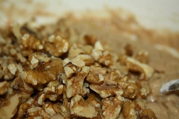 Mix through the crushed walnuts then pour into a large oiled loaf pan (or two small loaf pans) and bake at 180 degrees for one hour.