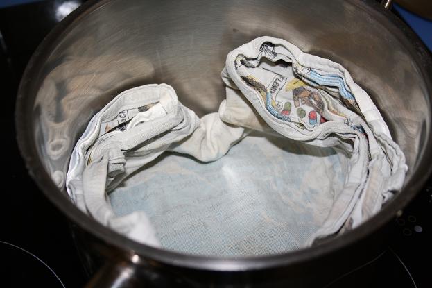 Put clean jars in the saucepan, wedge the edges of the towel between the jars to stop them banging into each other.