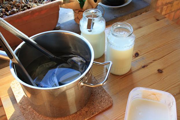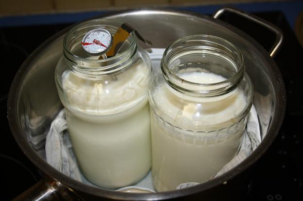 Pour hot water (probably not boiling water, that could end badly) around the jars. At this point you need a milk thermometer, heat the milk to 85 degrees (185 Fahrenheit). This kills bad bacteria in the milk and does something to the proteins so the yoghurt bacteria are happier to eat it.