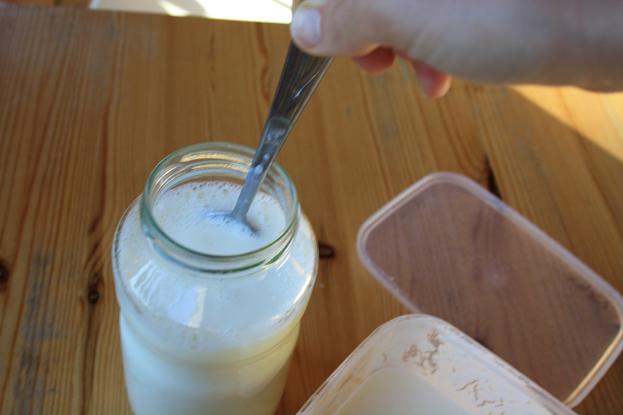 When the milk is at 45 degrees you add existing yoghurt to the milk. The first time you make yoghurt you need some from the store, but next week you use the yoghurt you made the week before. It is worth while putting a small amount of your yoghurt from each batch into a clean container for the next week.