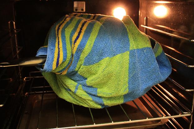 Then you need to try to keep the mix at 32 to 45 degrees (90-110 Fahrenheit) for around 8 hours. I have done this successfully by putting the jars back into the still warm water, wrapping it in a beach towel and placing it into an oven that has been warmed to about 50 degrees (120 Fahernheit) and then you turn the oven off but leave the light on.