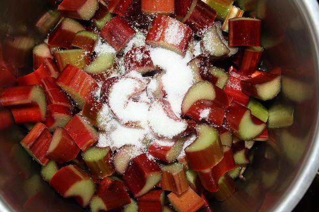 Put the water at the bottom of the pot to help stop the rhubarb burning, add the rhubarb and sugar.