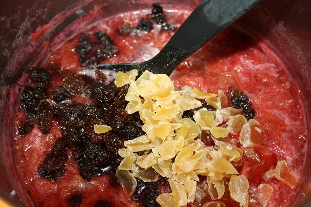 Turn off the heat and stir through the ginger and sultanas, allow it to rest while the sultanas swell and the mixture cools a little.