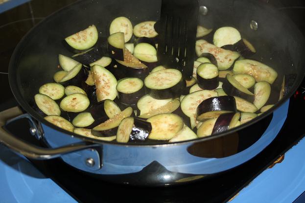 Add the eggplant to the pan, frying until the oil is absorbed. Once the oil is absorbed, add half the water one tablespoon at a time, allowing each tablespoon of water to be absorbed before the next is added.