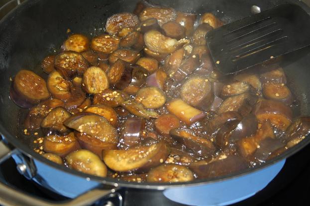 Once half the water is absorbed, add the remaining water, sugar and soy. Stir then cover to cook for 5 to ten minutes until the eggplant is nearly cooked through. When the eggplant is very nearly cooked, remove the cover and let the sauce reduce until it is thicker and sticky.