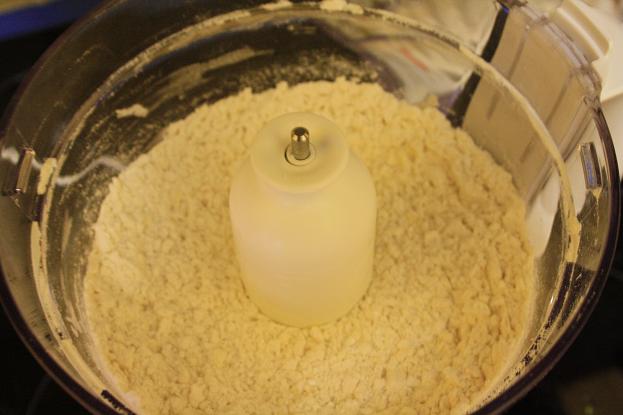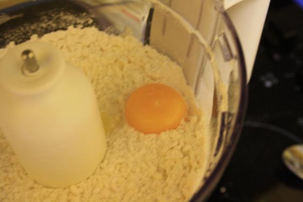Add the egg yolk and chilled water and continue to process until the mix just comes together, be careful not to over process.