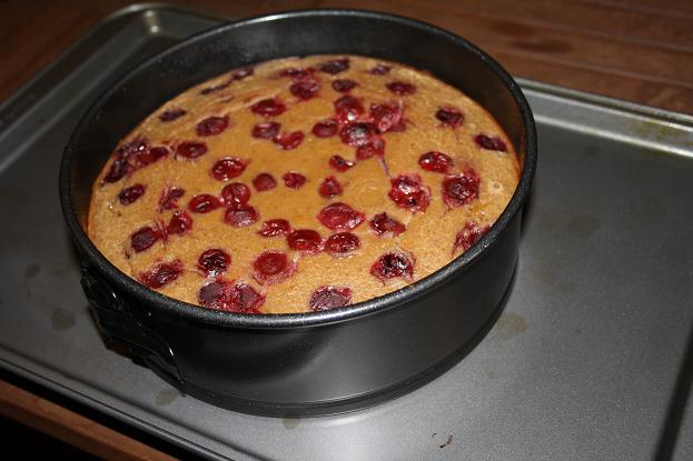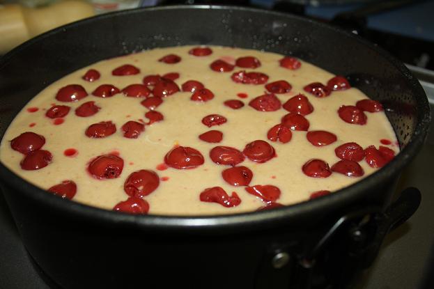 Poor the chestnut mix onto the tart base then spread the cherries evenly on top. Bake at 180 degrees for around 1 hour until the middle doesn’t wobble when the pan is gently moved.
