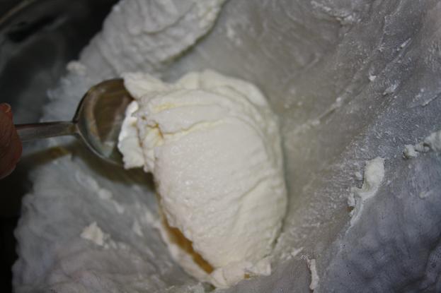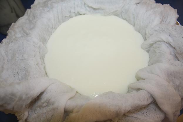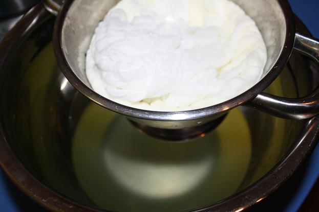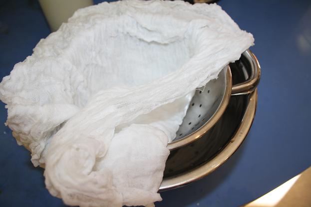 Make sure your equipment is very clean, I like to soak my muslin in boiling water for a few minutes. Set up your straining system: I place a small colander over a bowl and then place the muslin on top. Pour the yoghurt into the muslin.
