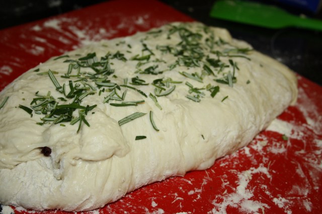 Add your flavours now: spread half the olives and rosemary on the top, then fold the edges over to meet in the middle, then do the same thing again with the remaining olives and rosemary. Fold until you get a long rectangle. Make sure the dough is well covered in flour and then dump the dough (fold side up) into your pan. Leave it to rise for 2 hours.