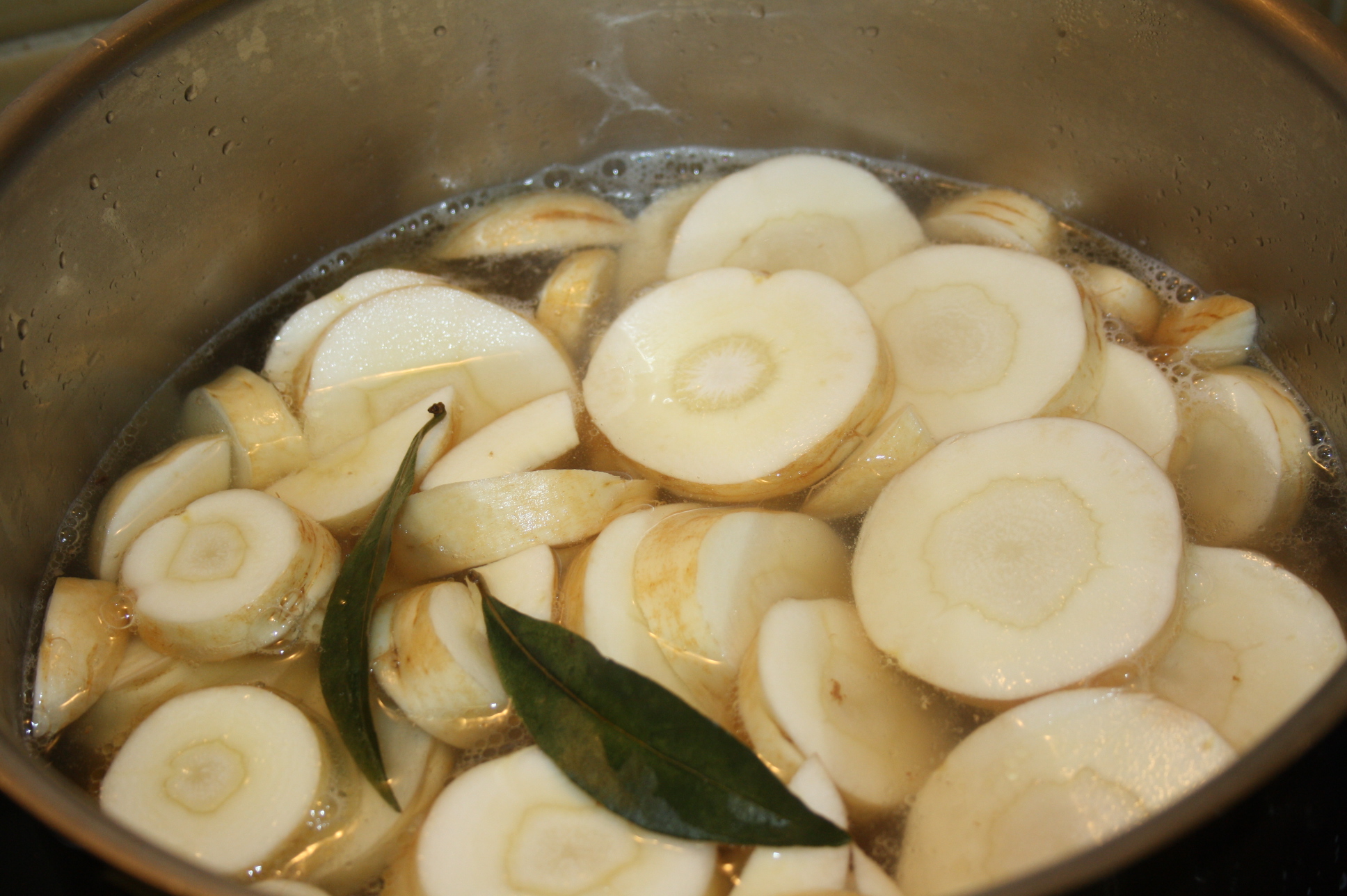Once the onion is soft, add the potato, parsnip, bay leaves and stock to the pot and then add water until the vegetables are just covered with liquid. Simmer for 30 to 40 minutes until the potato is soft enough to squash with the back of a spoon. Use either a blender or stick blender to puree the soup.