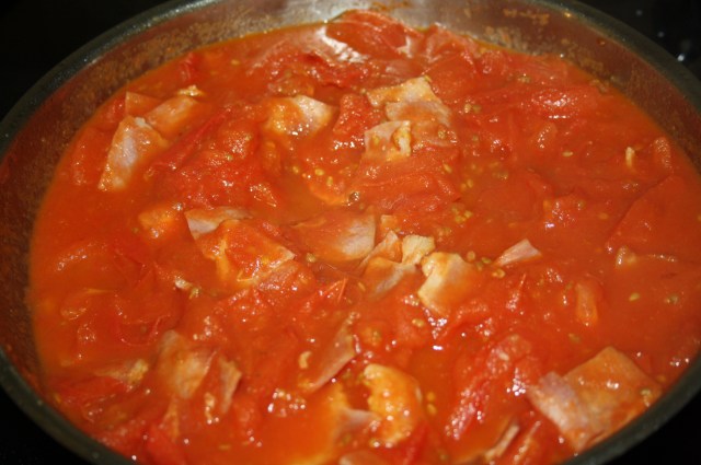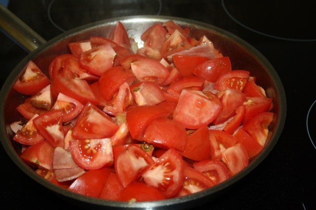 Roughly chop your tomatoes and then add them to the pan. Cover with a lid and simmer on a medium heat until the tomatoes are disintegrating.