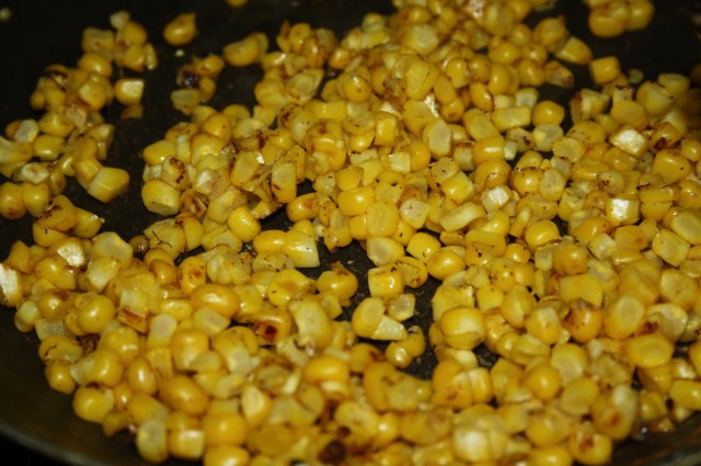 Fry the corn until it colours a little and releases all its sweetness. The corn will be little bursts of sugar on your cracker. Then fry the bacon until crispy and dice it into small pieces.