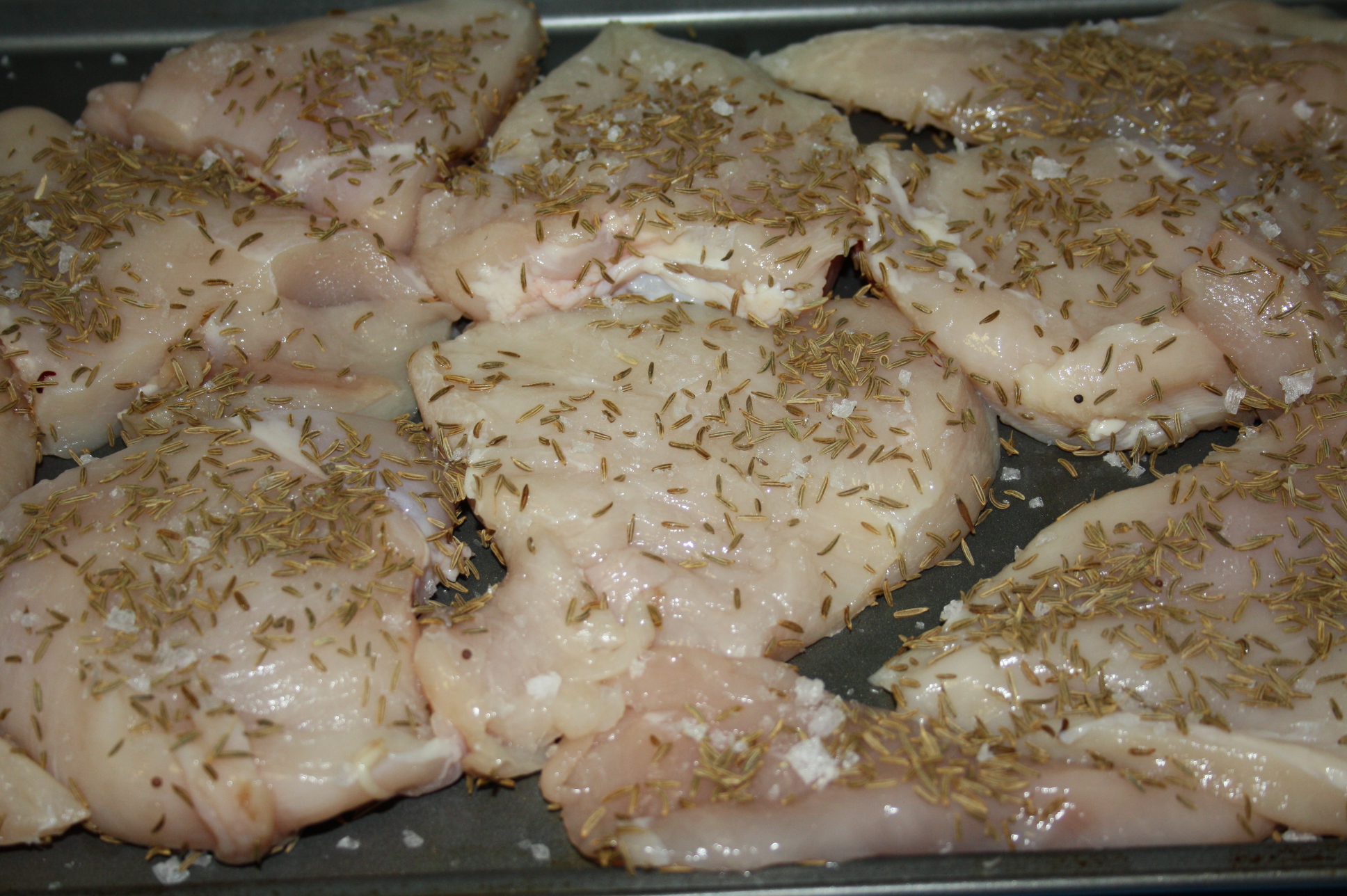 Sprinkle caraway seeds and salt over you chicken thighs plus a little oil. The picture has more seeds than I would usually use because my caraway seeds were getting a bit old and weren’t as punchy. Probably about half a teaspoon of caraway seeds per person would be plenty. The store didn’t have chicken thighs this night so I used chicken breast, and it wasn’t quite as good. Chicken thighs stay more moist when cooking and have a little more flavour, this really works better with burgers than drier, blander breast meat.