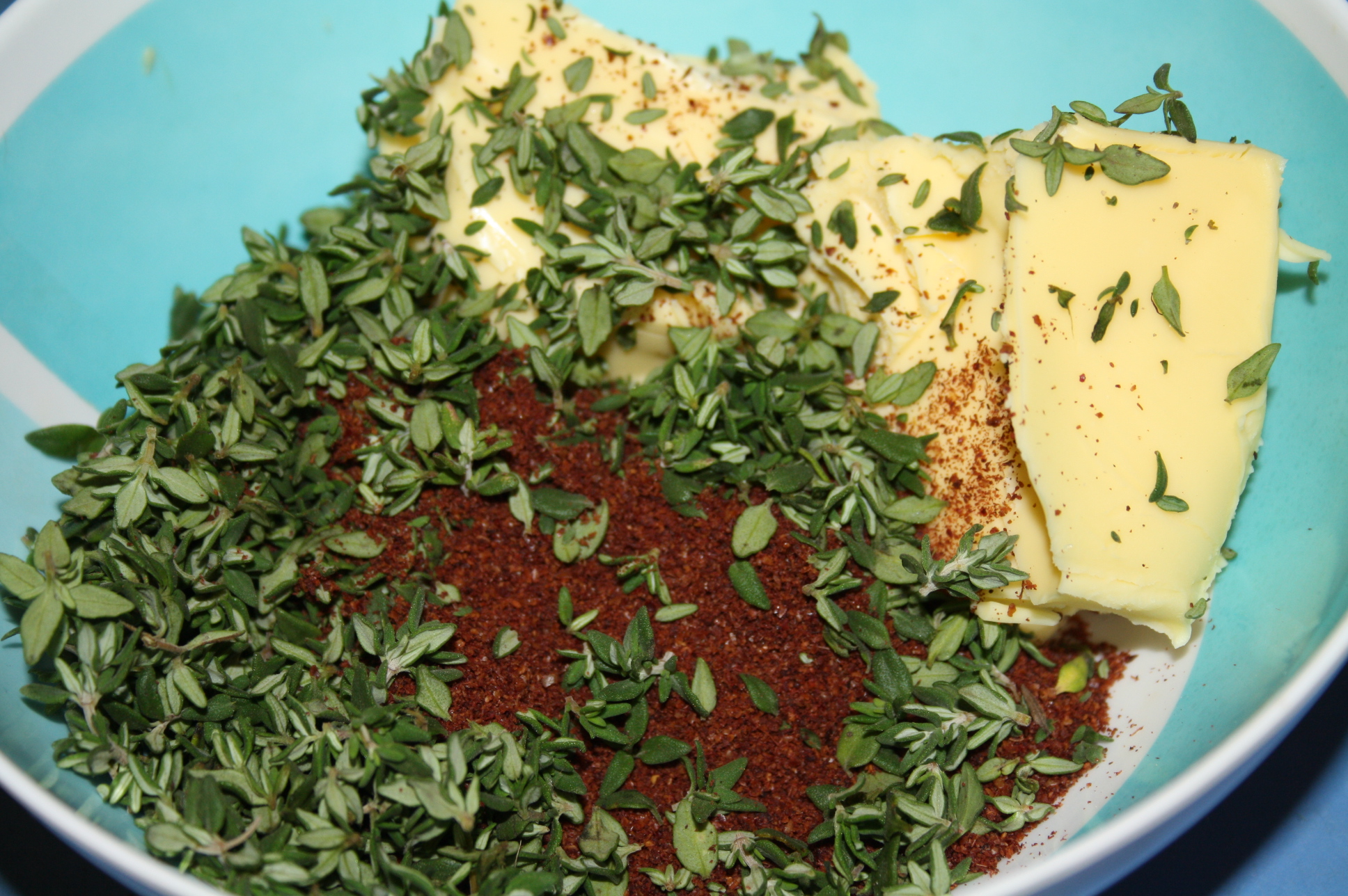 To get the flavour into the chicken, mix the sumac, thyme and salt into the butter.