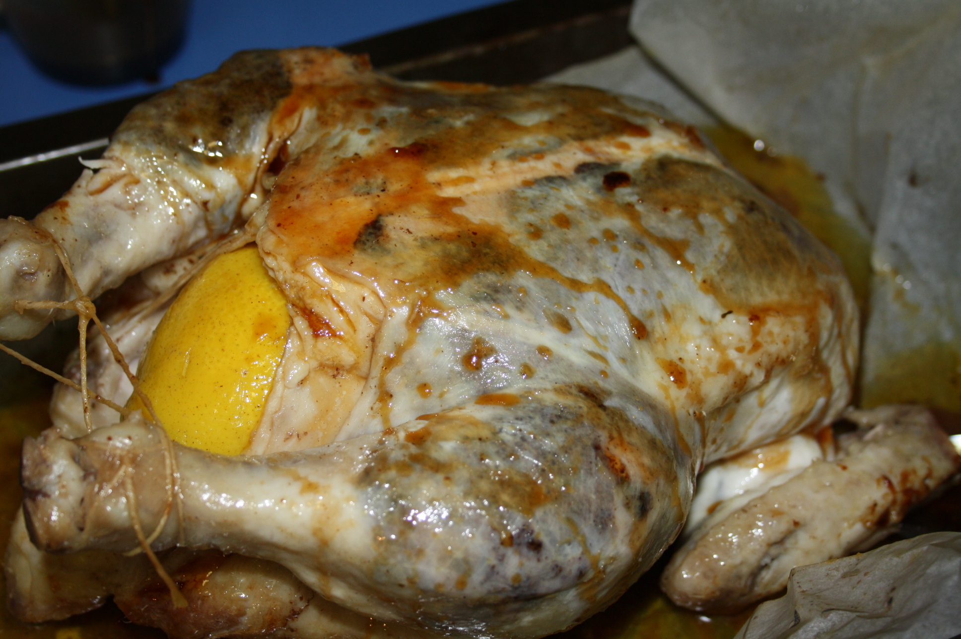 15 minutes before you are ready to roast, preheat your oven and boil the lemon for about 5 minutes, then, being careful not to burn yourself stab it a few times and then shove it in the chicken cavity. I had also put the stripped thyme stalks in the cavity for even more flavour. If necessary, tie the drumsticks together with cooking twine to hold the lemon in.