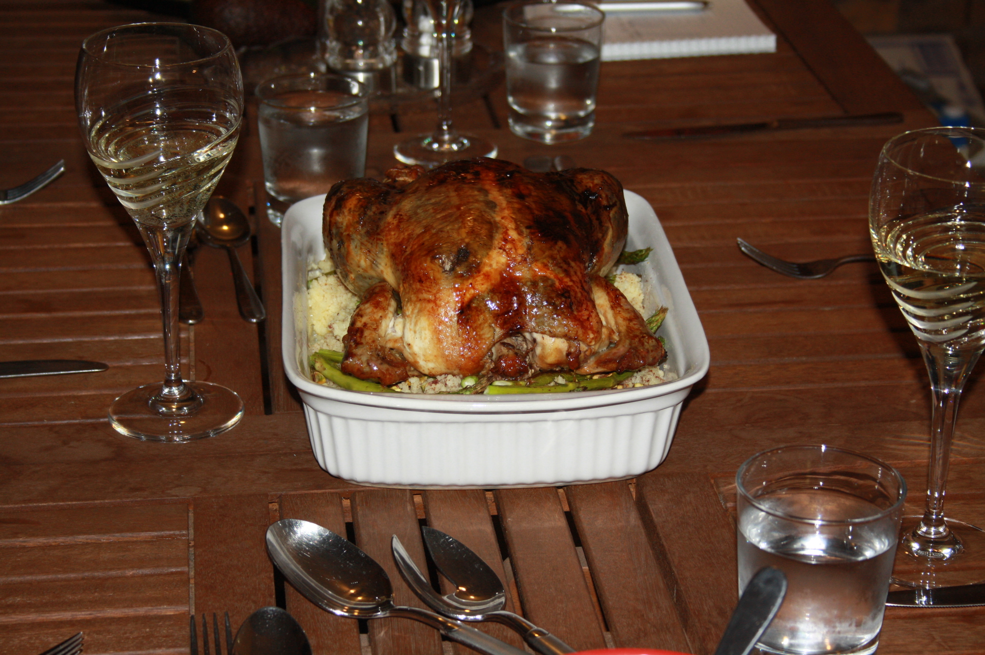 Sumac and thyme are the key spices in za’atar, and thyme and chicken are good together, so thyme and sumac seemed like a good flavour local from which to start. Then, given my current obsession with pomegranate, who could go past adding another citrusy layer to the flavours, and to top it off, I shoved a lemon in the cavity while it roasted.
