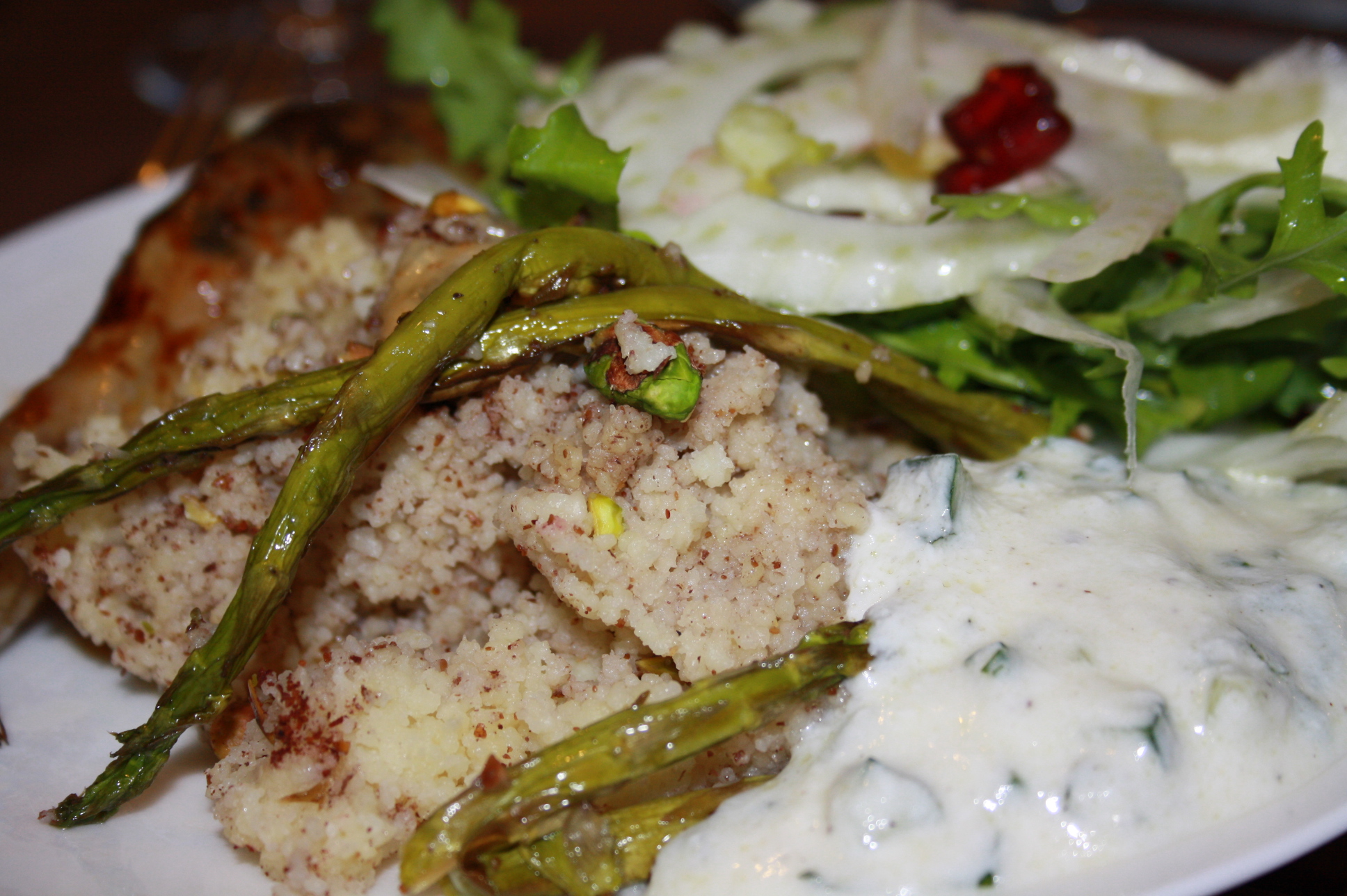 K and I had the sumac and asparagus couscous with some spiced tempeh and tomato salad which was super tasty in that combo. But when the chicken juices, all lemon-thyme-pomegranate-buttery goodness soaks in it was heavenly.