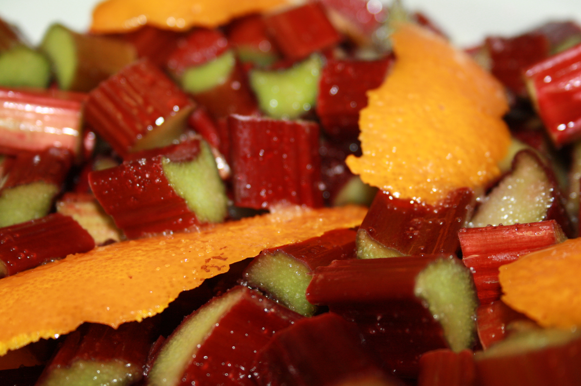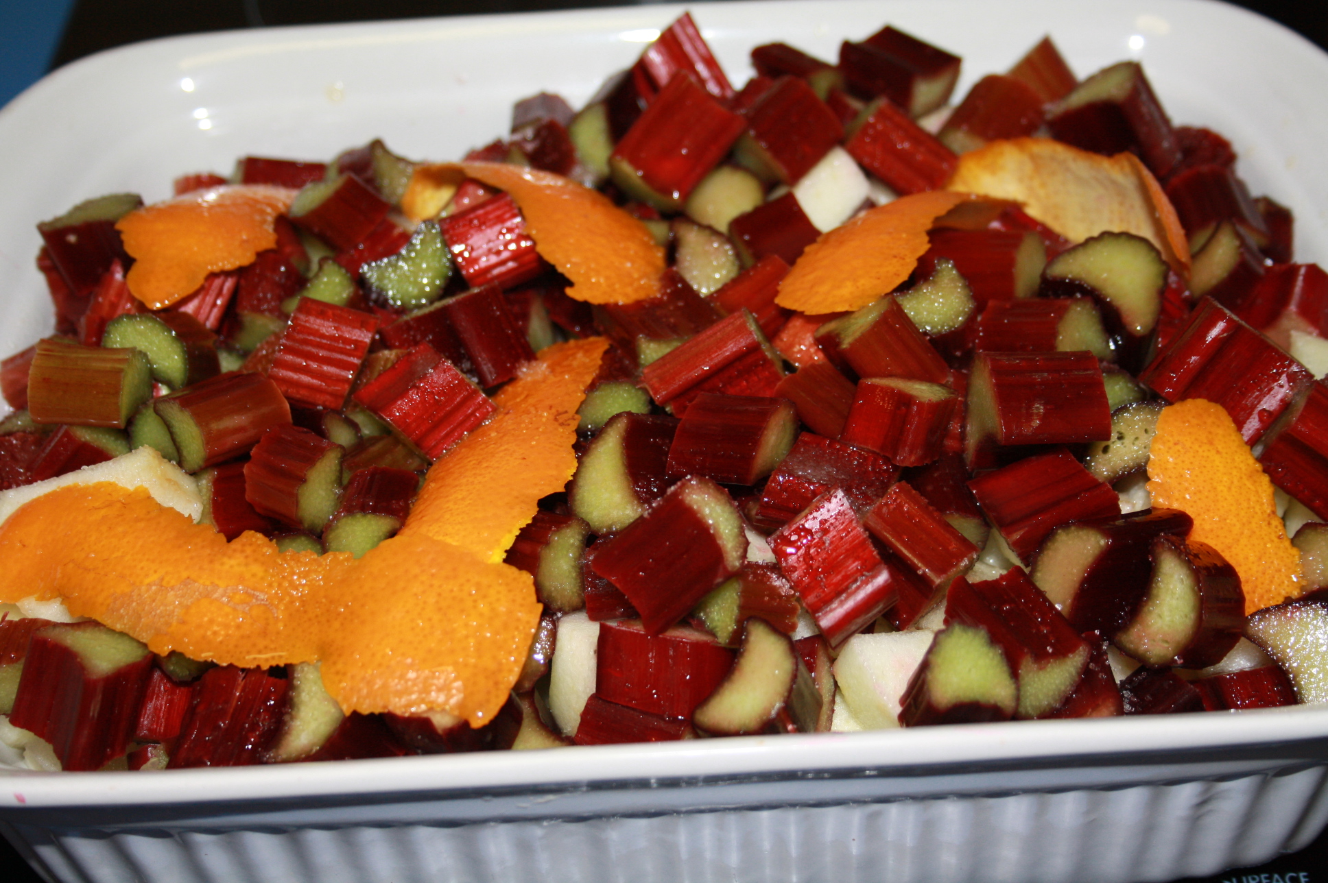 Combine all the ingredients in the baking dish. Place the orange rind amongst the apple and rhubarb.