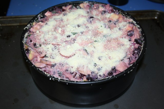 Pour the ricotta and vegie mix into the pan and then sprinkle with the parmesan. This makes the top taste just that bit more delicious without adding heaps of calories.