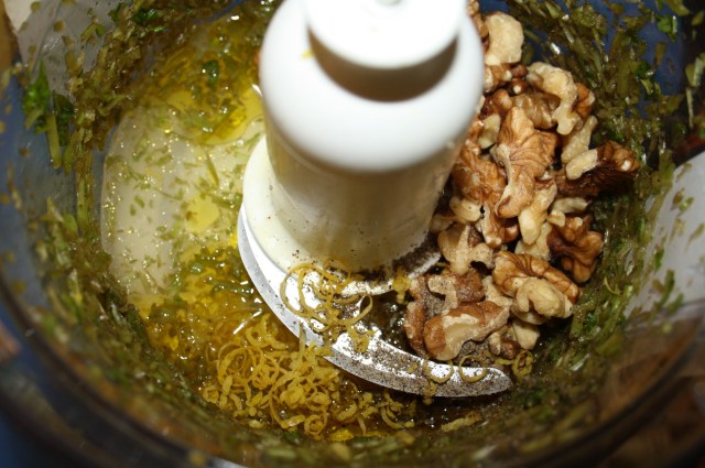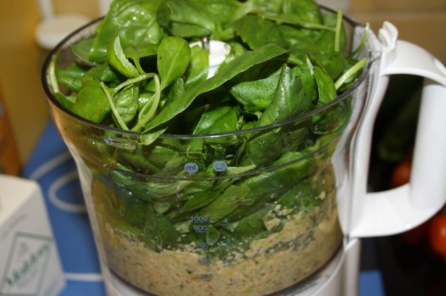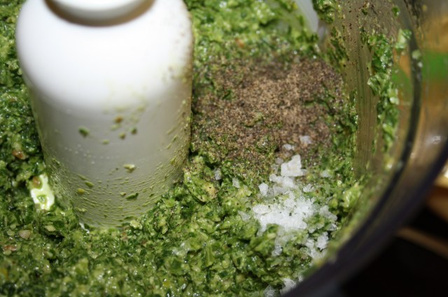 Once the stalks are well blended, add the leaves, I had to add them in two batches to get them in my blender. I added more nuts, salt, pepper and oil to get the flavour and texture right.
