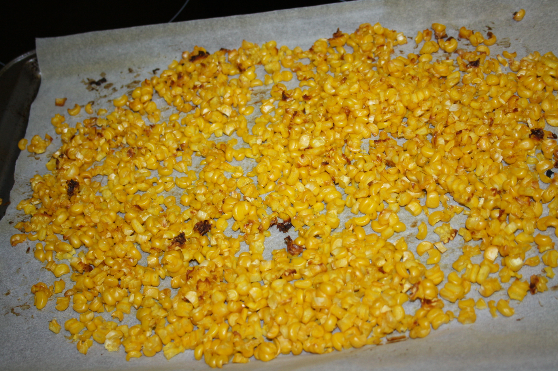 Place the corn kernels on a baking tray and grill (broil – Is that the right American-English term?) the corn until it is at risk of burning. You should stir it a couple of times during the cooking.