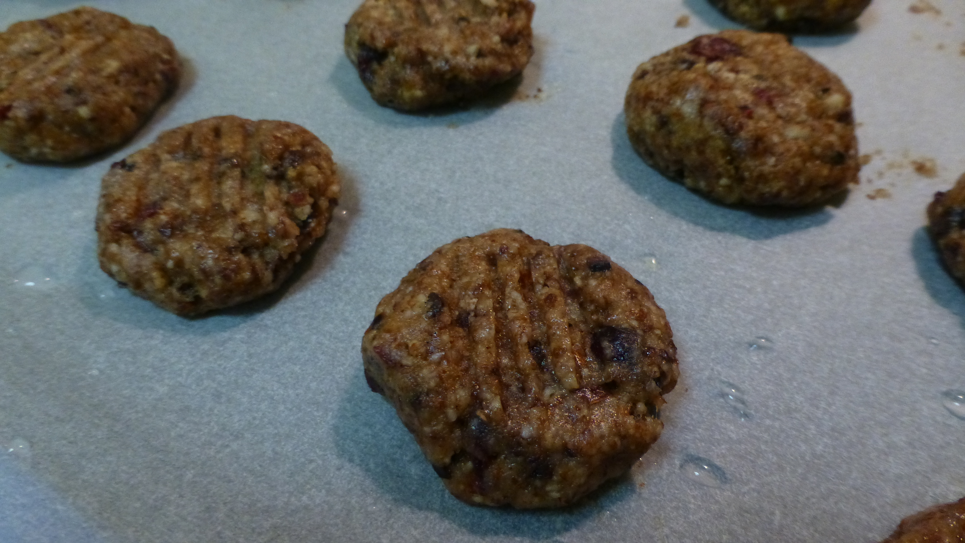 6. on a baking tray make small balls from the dough then flatten slightly with a fork (they won’t spread when baking)