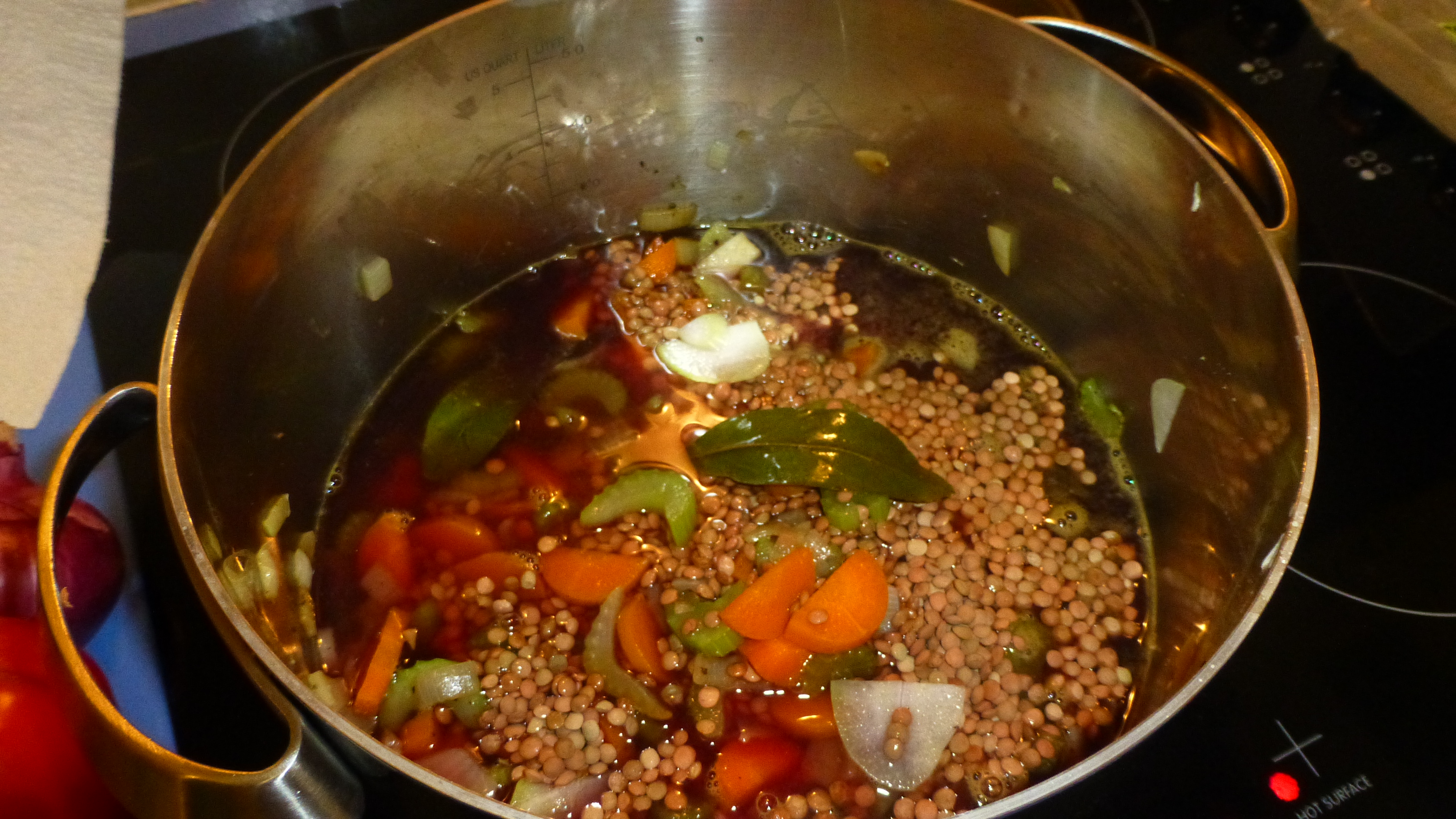 3. Layer on top of the onion mix the lentils, one stock cube, eggplant, mushrooms, wine, water and tomatoes. Simmer for 1 to 2 hours until rich and a little thickened.